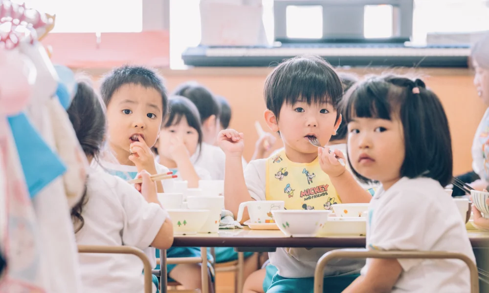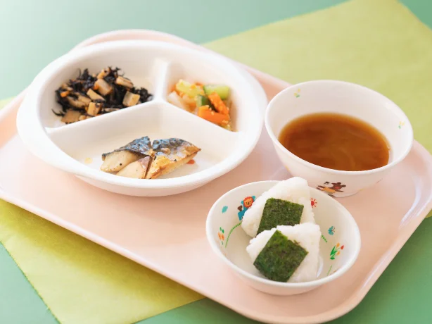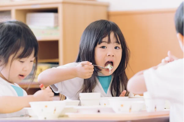 給食です。お友だちと一緒に食べます。