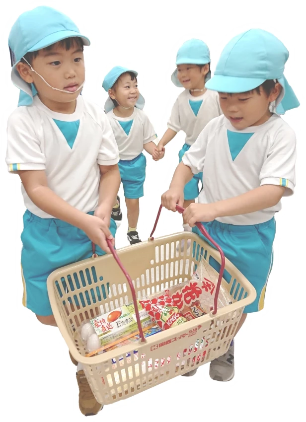 スーパーやパン屋さんなど地元のお店にご協力いただき、園児たちはお買い物に出かけます。保育園の中だけではなく積極的に街に出て、地域に見守られながら育っていくことを大切にしています。