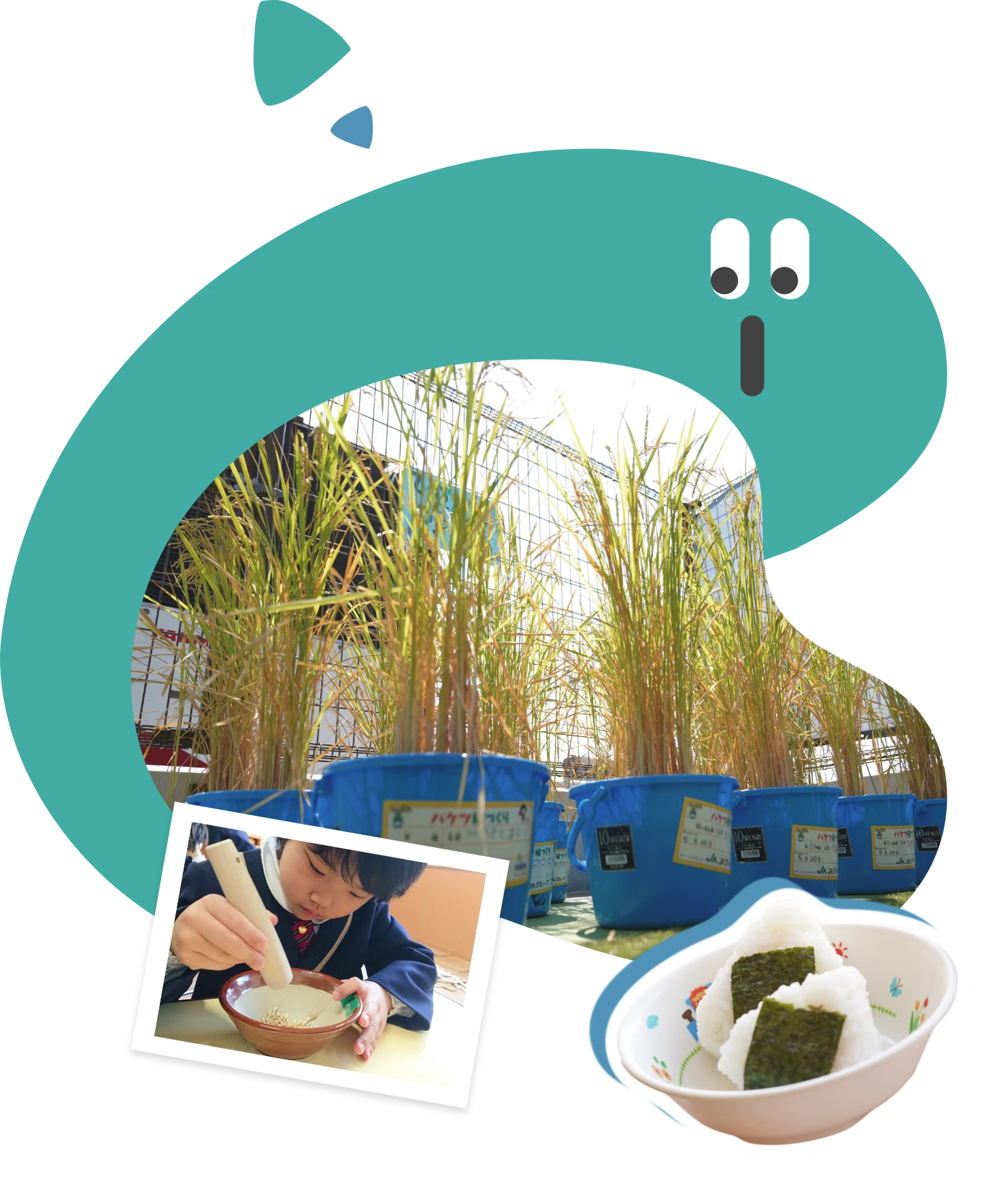 毎年子どもたちが屋上でお米を栽培しています。種もみから苗を育て、毎日の水やり、お米日記。収穫後は脱穀・もみすりまで体験します。稲穂の時期はカラスさんを追い払うべく屋上で奮闘する保育士の姿も見られます!