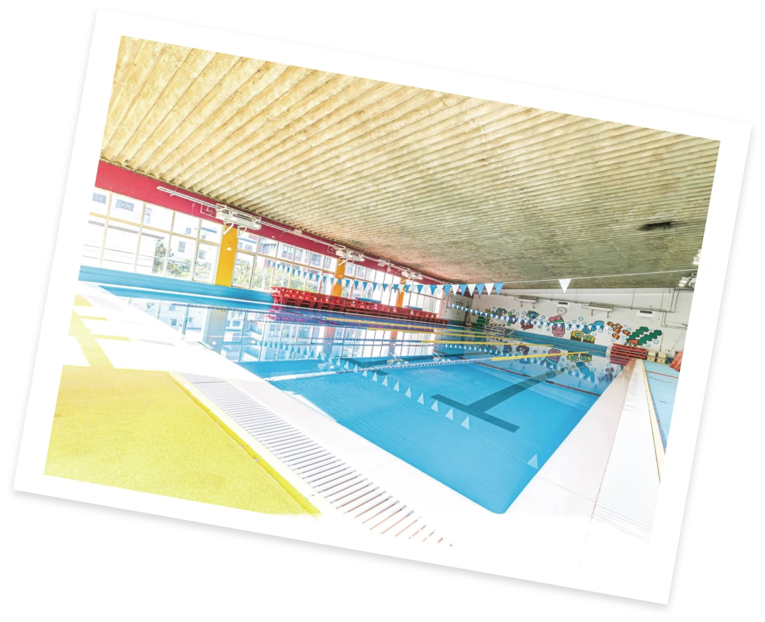 4-5歳からは月2回、スイミングスクールへ通い、プロのインストラクターに水泳を習います。プールへは送迎バスでラクラク往復。幼児期に水泳に親しむことで神経系機能の発達を促し、体幹を鍛えます。